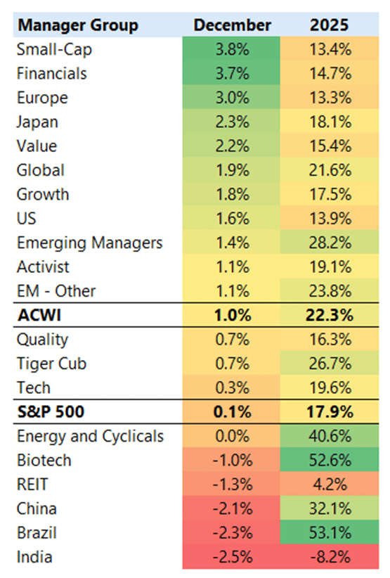 The disclosed holdings of our Small Cap, Financials, and Europe groups had strong performance in December. Managers focused on China, Brazil and India had a tough month, down more than 2%. After a strong 6+ month run, our Biotech group retreated slightly, down 1% in December. For the full year 2025, the disclosed holdings of our Biotech group remained among the strongest performers, only slightly trailing our Brazil group.
