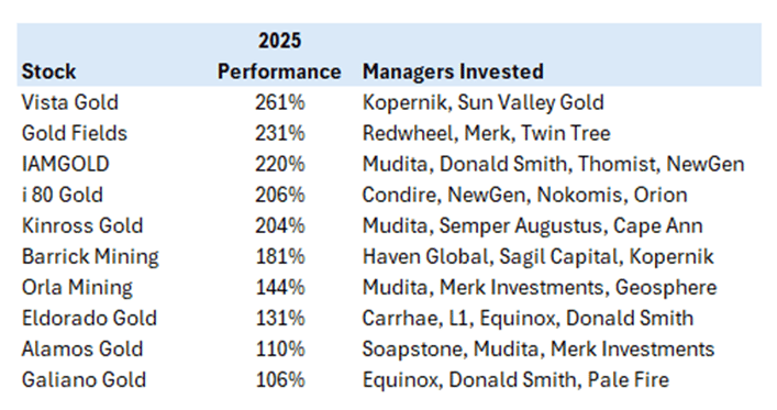 Gold was a meaningful performance driver in 2025, as investors continued to use the metal as both a hedge and a portfolio diversifier amid shifting expectations for rates, growth, and geopolitical risk. While bullion exposure itself delivered strong returns, many of the most notable gains came through gold equities. This week, we highlight a handful of managers who benefited from these tailwinds in 2025. To set the stage, the table below shows a selection of gold-related stocks, along with their performance in 2025.