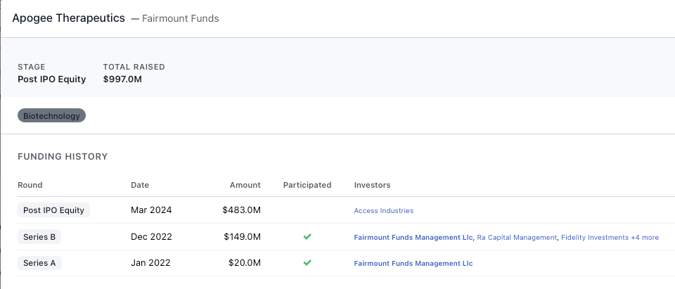 Fairmount invested in several of the aforementioned companies before they went public as well, as shown by OWL’s new private holdings data. Users can easily see which of each company’s rounds Fairmount participated in, as demonstrated by the funding history page for Apogee Therapeutics.
