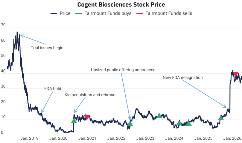 The private placement was Fairmount’s first buy of Cogent and it continued adding to its position as Cogent’s share price bounced around between $4 and $16 for the next five and a half years before rising sharply in November 2025 to peak at over $40 following the news that the FDA had granted its new gastrointestinal stromal tumors treatment a breakthrough therapy designation. Fairmount then nearly halved its position in January 2026, locking in substantial profits.