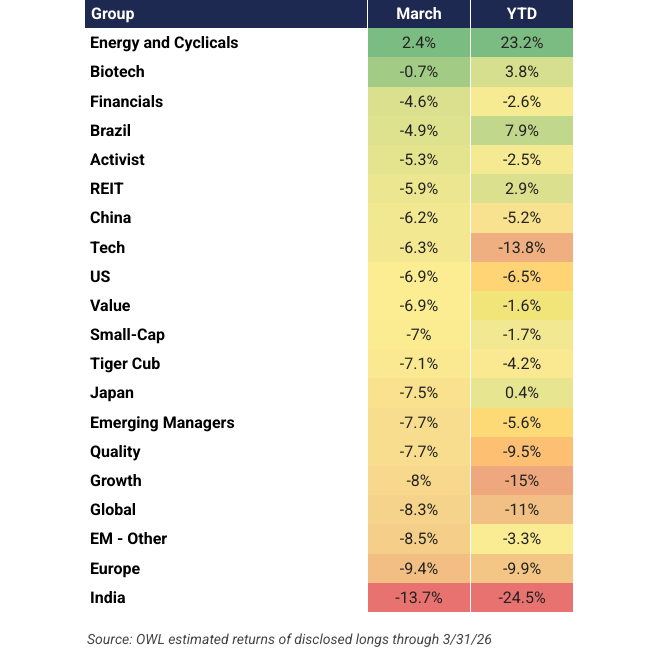 Managers in OWL’s Energy and Cyclicals group saw their holdings perform well in March, putting them on a 3-month streak as the best performing group this year. March was a tough month for most other manager groups with the next best performance coming from Biotech at -0.7%.