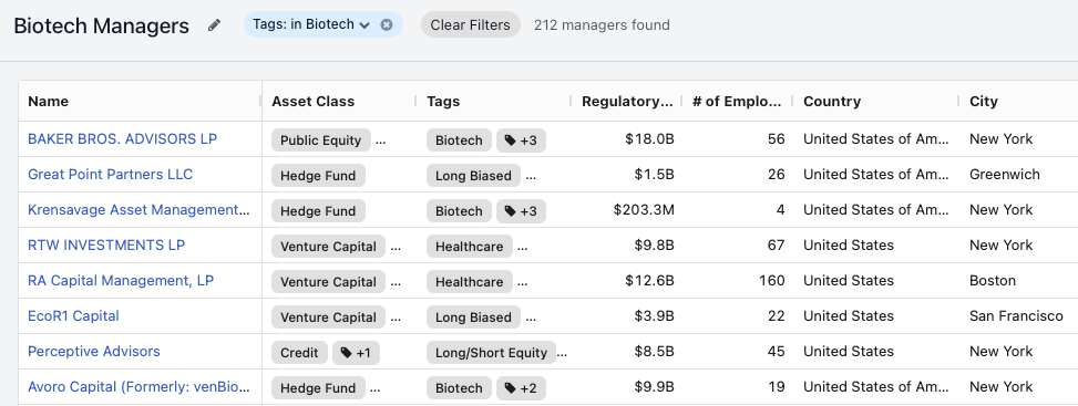 As a reminder, OWL users can use our Manager Search functionality to filter our 19,000 managers by a wide range of factors. Below we show a list filtered for Biotech which returns 212 managers that could be further filtered by criteria including location, AUM, disclosed LPs, returns, and specific private holdings:
