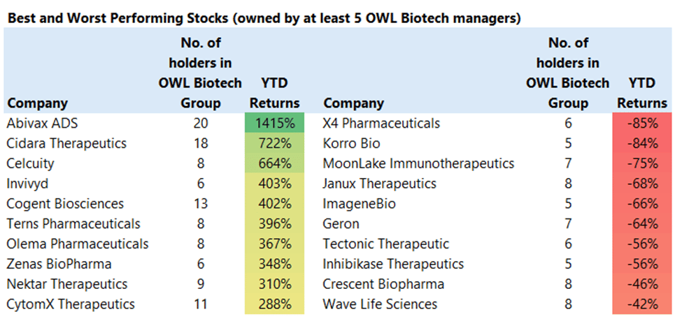 As a side note, in July we noted the impact of Abivax on Biotech manager returns, with the stock up 800%+ during the month. Since then, the stock is up another 67% and remains the top performing Biotech stock in the OWL Biotech portfolio this year, by a wide margin.