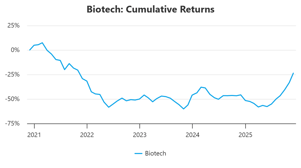 Up an estimated 14% in November and 56% YTD, OWL’s biotech group is one of the best performing groups of managers in 2025. We initially wrote about Biotech in July, just as returns were starting to pick up following a tough 4-year stretch: