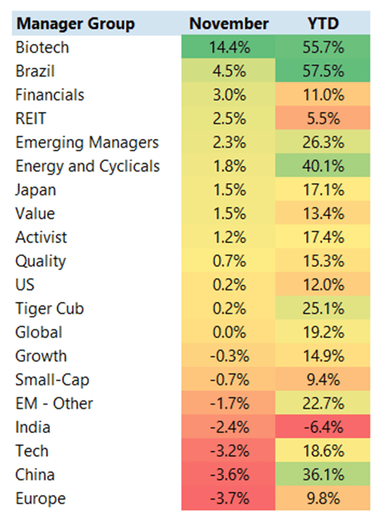 The OWL Biotech group continued its strong performance in November, up an estimated 14% for the month. Our Brazil, Financials, and REIT groups also had a good month, while Tech, China, and Europe underperformed.
